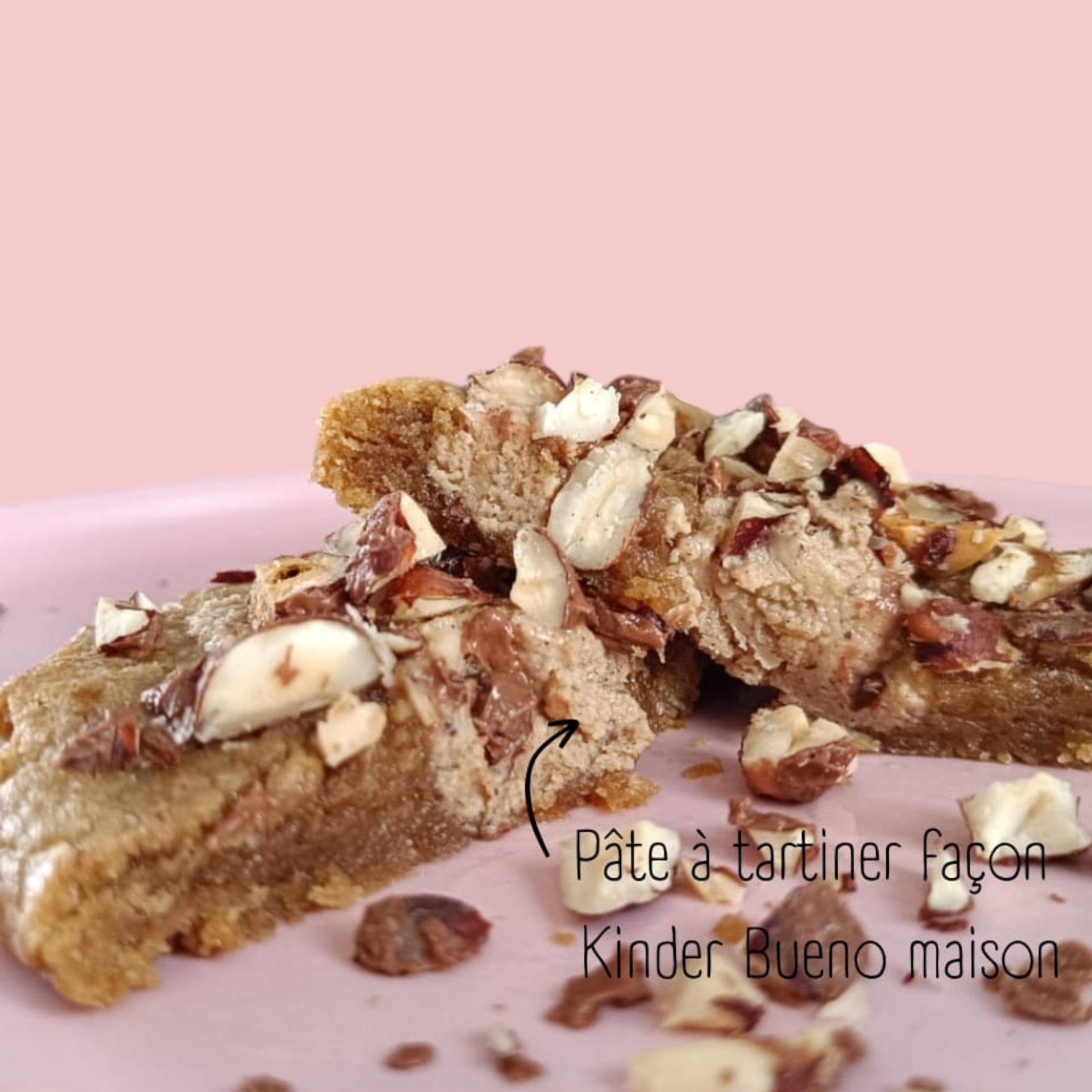 Le Cookie façon K.Bueno est une délicieuse gourmandise composée d'un cookie moelleux et d'une pâte à tartiner maison au goût Kinder Bueno, le tout parsemé d'éclats de noisettes enrobées de chocolat au lait.
